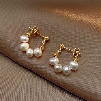 女性18KゴールドメッキS925スターリングシルバージュエリー本物の合成バロック淡水フープ真珠イヤリング